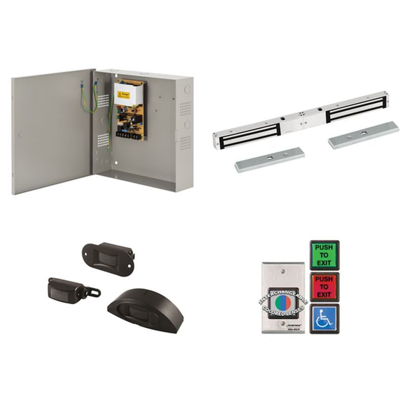 600LB Double Door Mag Lock Kit, 1.5A Power Supply with F.A. Relay, IR Eye, and Pushbutton w/ 30 Sec. Timer